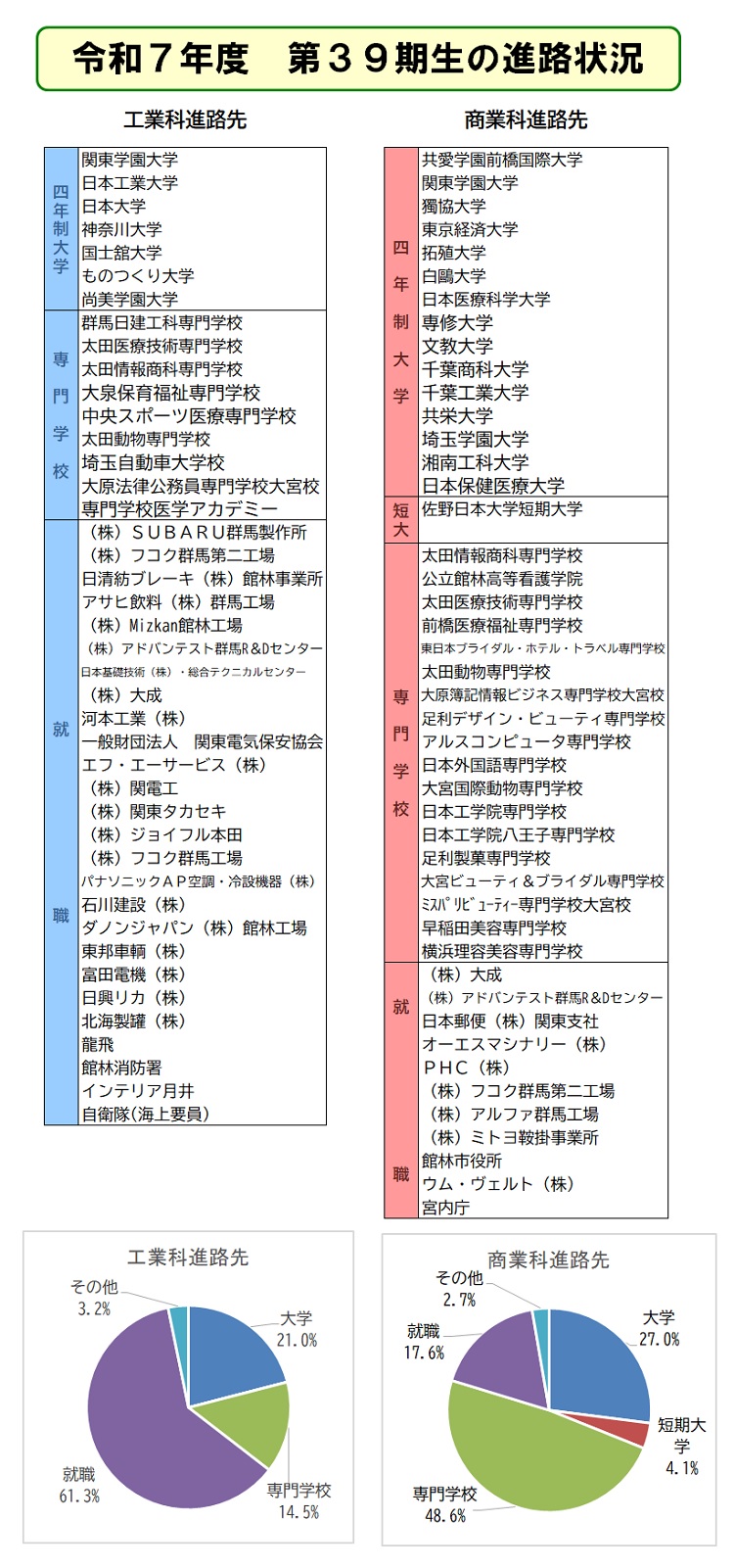 就職者数は昨年度より増加しましたが、学科ごとに興味深い傾向が見られます。工業科では、卒業生の6割を超える38名が就職を決定しました。これは製造業が盛んな邑楽館林地区という立地、そして本校の専門教育が地域に信頼されている証と言えるでしょう。一方、商業科の就職者は13名に留まりました。これは、医療・IT・美容といった専門分野を「さらに大学や専門学校で深く学んでから職に就きたい」という、キャリア形成への意欲の表れだと分析しています。また、公務員の合格者も増加傾向にあります。